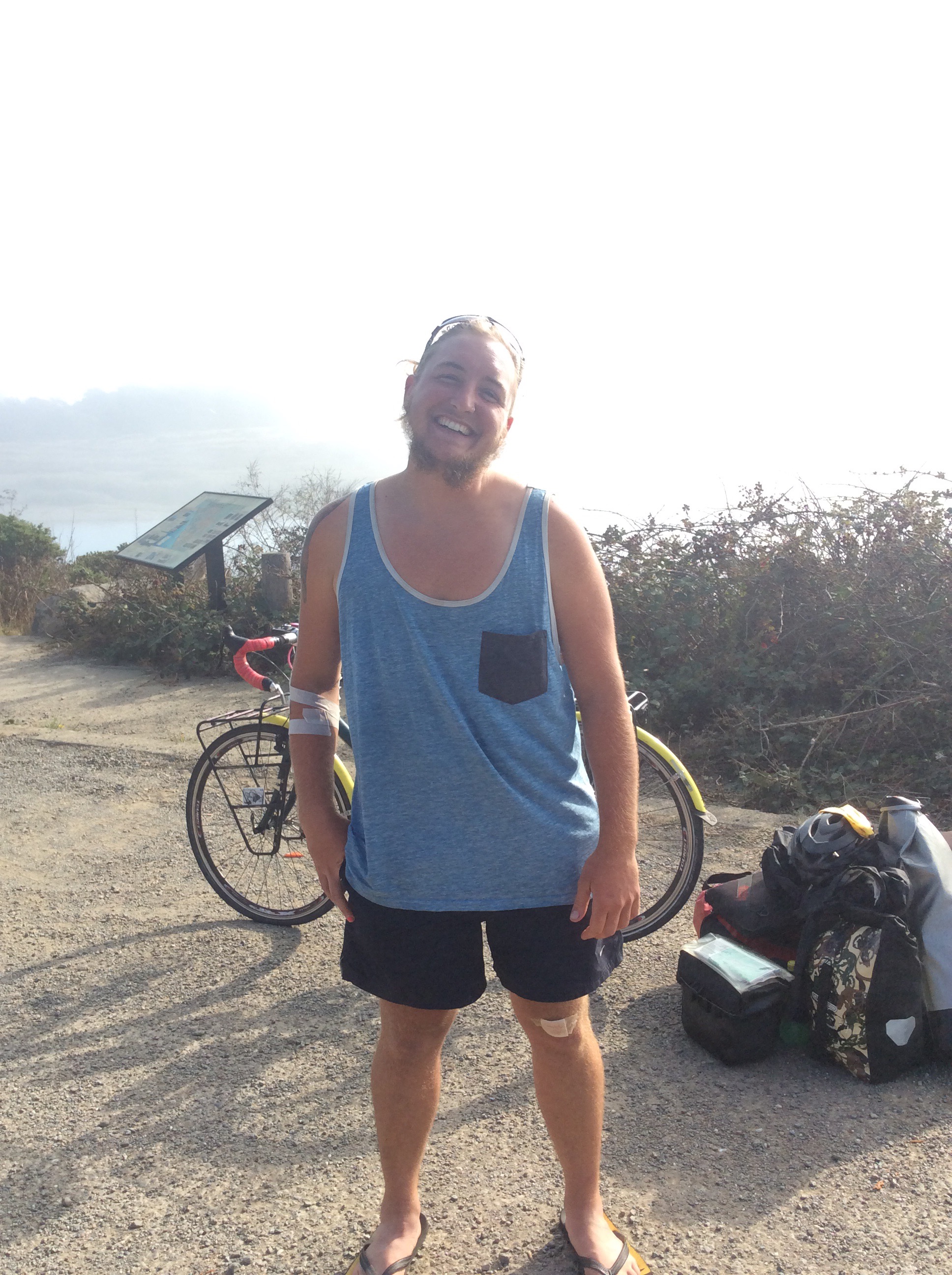 The next day feeling refreshed from a bed me and Gray were in jubilant mood, cheering as we hugged the Pacific Coast down route one. We cycled side by side and chatted away about all manners of things, I enjoyed his company and he tolerated my abstract musings in an encouraging fashion. He was about to complete a 5000 mile stint, just 2 days from San Francisco, we planned to cross the bridge together and he carried a lovely little Martin acoustic with him which I was stoked about. Riding side by side we talked of how safe we felt touring was compared to city riding, classic mistake as no more than minute later an rv rammed it’s mirror into Grays shoulder, descending a hill at a good 25 miles an hour. Gray flew off his bike and flipped three or four times with his bike before eventually coming to a halt. A hundred meters or so behind I expected limbs at right angles on my arrival and prepared for a gruesome sight. By grace or good fortune limbs were In tact and he was just about in one piece though understandably shaken, his bike unfortunately was not. I calmed him down with some inappropriate jokes, a smoke and some lunch. We patched up what we could and sorted out his travels back to San Francisco. I bumped into him later, ecstatic to find that bones and spirit seemed in tact, a sense of vulnerability however lingered.