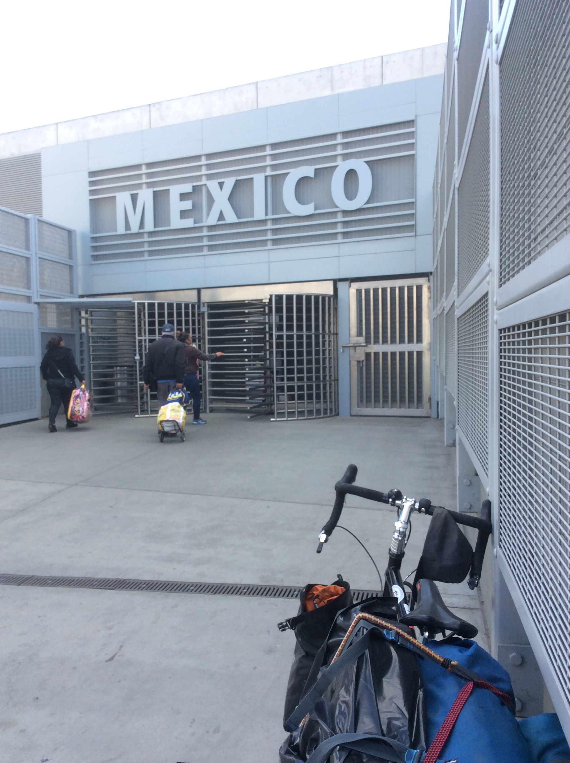 Merle came to see me in the morning I planned to ride to the border and told me of a storm that was blowing in, hail and the like. He advised that me and Ian, who was also staying in the casita to hold it out another day. As much as I didn’t want a storm to add to the drama of entering Mexico my feet were itching more than ever and I hit the road. The storm effectively blew me to the border, barley having to move the pedals. I stopped at one last bike shop to find Tom a Cornish fella, who gave me a coffee and a pump I’d been looking for all over San Diego for free and wished me well. ” Your gonna like Mexico, it’s like England” he told me. I didn’t have the foggiest what he meant. Cycling parallel to the river, ordained with huge spotlights, that separates Mexico from the US I was filled with a great mix of excitement and anxiety. The sinister weather added to the drama as I rolled my bike to the border centre. The border between the excessively wealthy California and northern Mexico is often talked of as one of the starkest contrasts on the planet. Trying to squeeze my bike through the steel border gates, my new addition of a guitar and kit got wedged in the barriers and a que formed behind me as a family of Mexican kids pushed me through. The infrastructure and ease of west coast biking was strikingly no more, my paperwork was done (I hope) and I rolled out onto the pit holed streets of Tijuana fuelled by a renewed sense of adventure.