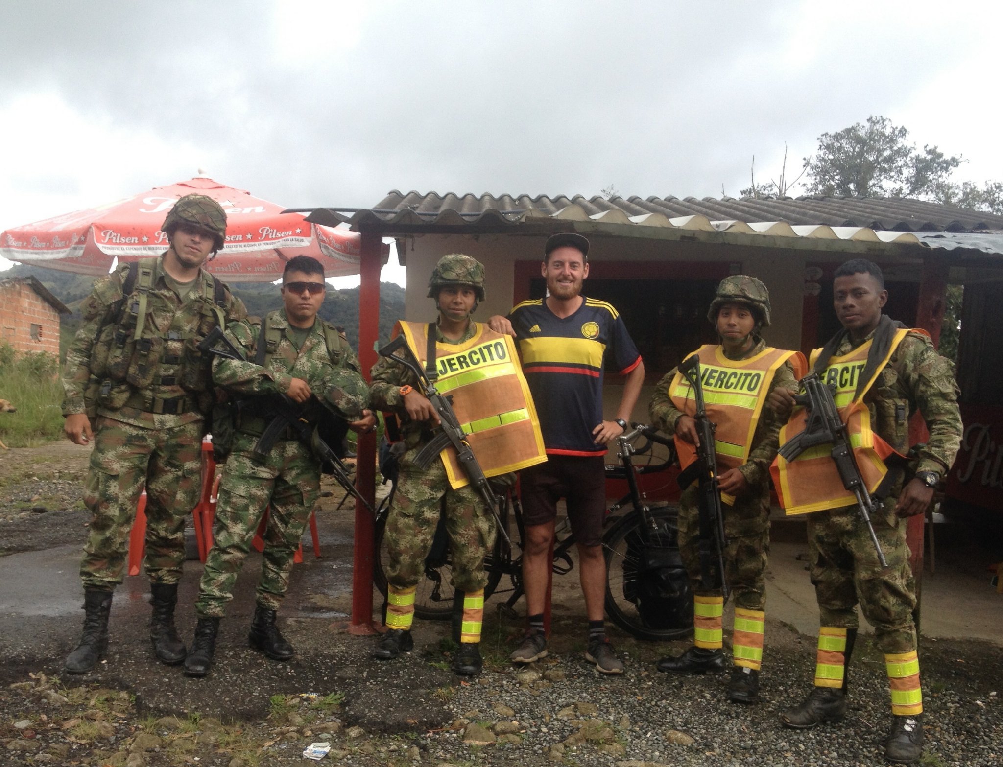 It felt brilliant to be riding again, I felt fit and well conditioned, reinvigorated and energised by the atmosphere of Colombia. I raced up a 2500 meter climb without moan, so excited by the prospect and fresh air and the mountains. For the first time in months the the temperature dropped below twenty and it felt like spring. Beautiful mountain villages full of tiny wooden bars and coffee shops akin to those I’d seen in the mountains in Spain, yet full of bouncing smiling Colombians. Every lady referred to me as “mi amor” and a gentle hand on the upper arm from most blokes. The cold dry air was so refreshing and my smell started to work again, I realised you can barley smell in the tropics and even the smell of the donkey shit had me giddy with excitement. I really felt alive and awake again. Donkeys carrying old pales of milk, the greenest of fields adorned with huge mountain rocks. The smells of spring flowers outside of beautifully modest mountain homes or cabins. Colombia already seemed to diverse. From the Caribbean majesty of Cartagena, through the agricultural flat lands and then up through coffee regions into the mountains in the space of a week. I hung out and played chess with the army in the rain one day, they insisted I would be married to a Colombian before I got to Ecuador. I told them they underestimated my determination and they disbellievingly laughed.