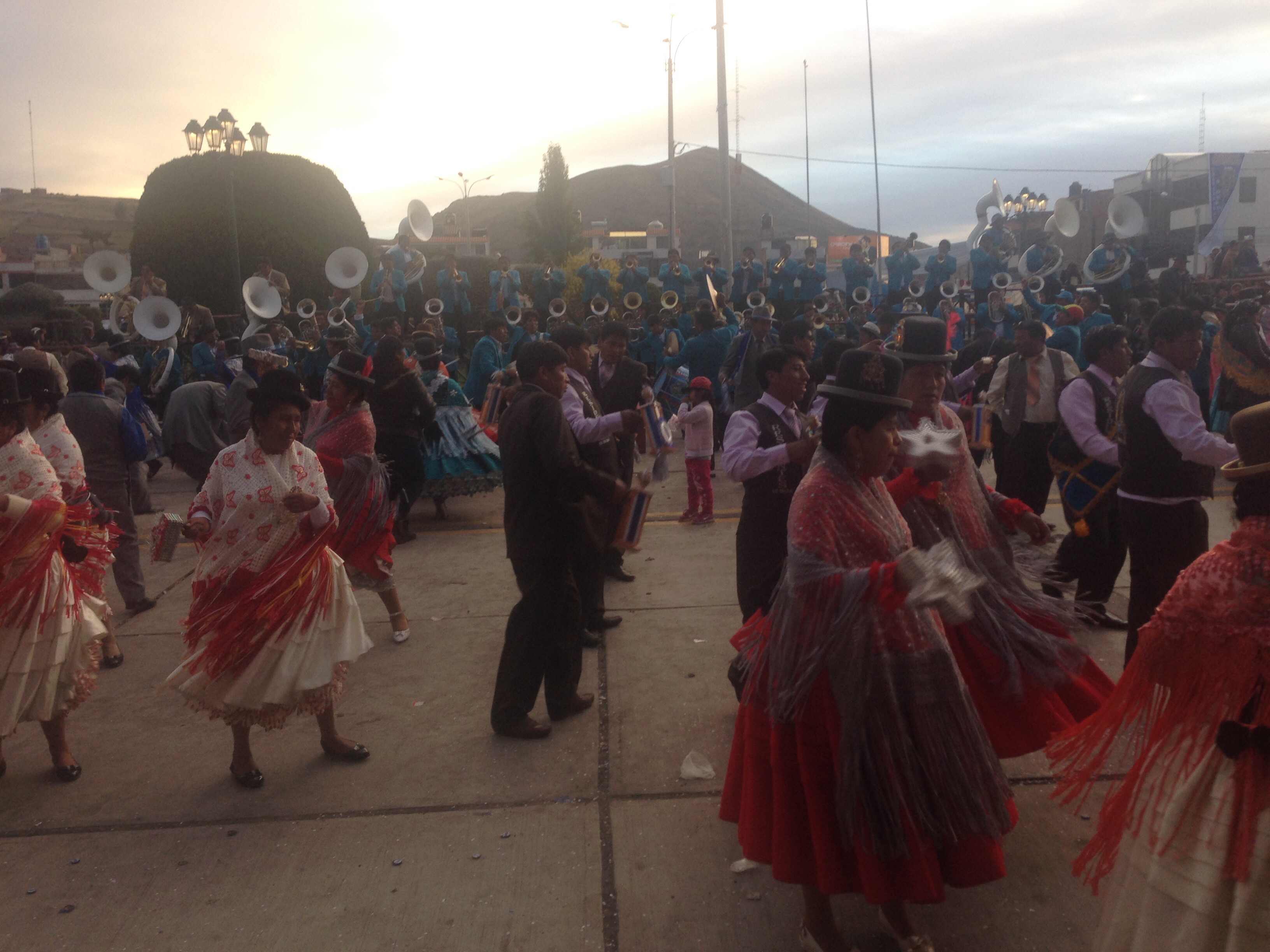 I arrived at the famous lake Titikaka at Puno which unsuprisingly was a bit of a tourist haven but still I thought it would be rude not to take a look. I wandered down the waterfront and found a boat out to the floating island of the Oru people whom decided this was a safe haven from the aggressive Incans and were still living here. Unfortunately, truck loads of tourists came by the hour and were plied with homemade tat to buy. I took the road south toward the border for the festival of the virgin de Candelaria in the town Juli, Peruvians dubbed the little Rome. The only gringo again and the party was going off. Dozens of dancing parades and the beer was flowing. Every corner of the town had a different group playing all thrusting booze down the brass sections throats. The incredibly dressed Amayran people were dancing like it was no tommorow and I looked a sight joining in. I was treated to head soup and fried liver followed by churros. The party went wild into the evening and the punches started throwing. It was an amusing sight seeing the older men and women,traditionally dressed trading blows. I found an old group in a less rawkus corner playing my new favourite genre, el tanante. Around fifteen blokes, mostly on different forms of saxophones plus a violinist and a harpist crafted the most enchanting and haunting melancholy melodies accompanied with off beat rhythms to which the drummer would add screams and whails. I couldn’t get enough of it as they played on and on into the night.