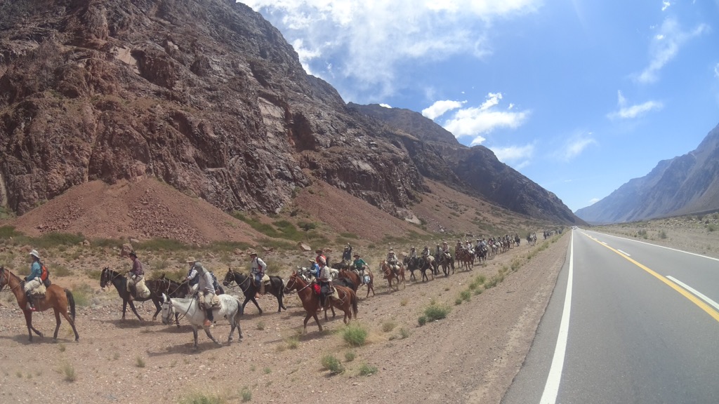The steady climb was spread over three days and took in some interesting sights along the way. I teamed up with a French couple who had quit the fire service and rode through Africa before starting South America, incredible stories of Africa had me dreaming of taking my bike there. We made a strong riding team and battled the wind up to the empty ski resort of Los Penitentes. South Americas highest peak, Aconcagua at nearly 7000 meters made its appearance to the right approaching the Chilean border, a truly formidable sight. We passed a parade of gauchos on horse back riding the pass to commemorate the 200th anniversary of the independence march. I stopped and chatted to a group of former soldiers who has fought in the Malvinas. A handful of times the first thing on the lips of Argentinians after stating my nationality was this war. There were even signs along the highway and on cars stating Malvinas Volvermos. As far as you can get from the island in the south east of Argentina all the way up on the Chilean frontier this was obviously still a big issue of discontent amongst Argentinians and it seemed for good reason. The border was as spectacular as any I had crossed with a dramatic change on the Chilean side. Suddenly the height of the pass was made apparent checking into Chile and the gentle gradient of the Argentinian side turned into 30 switch backs which I raced down overtaking the steady traffic amongst a haze of the black mountainsides and glistening white peaks. I fell the 3500 meters I had gained in three days in a little under two hours into the little town of Los Andees.