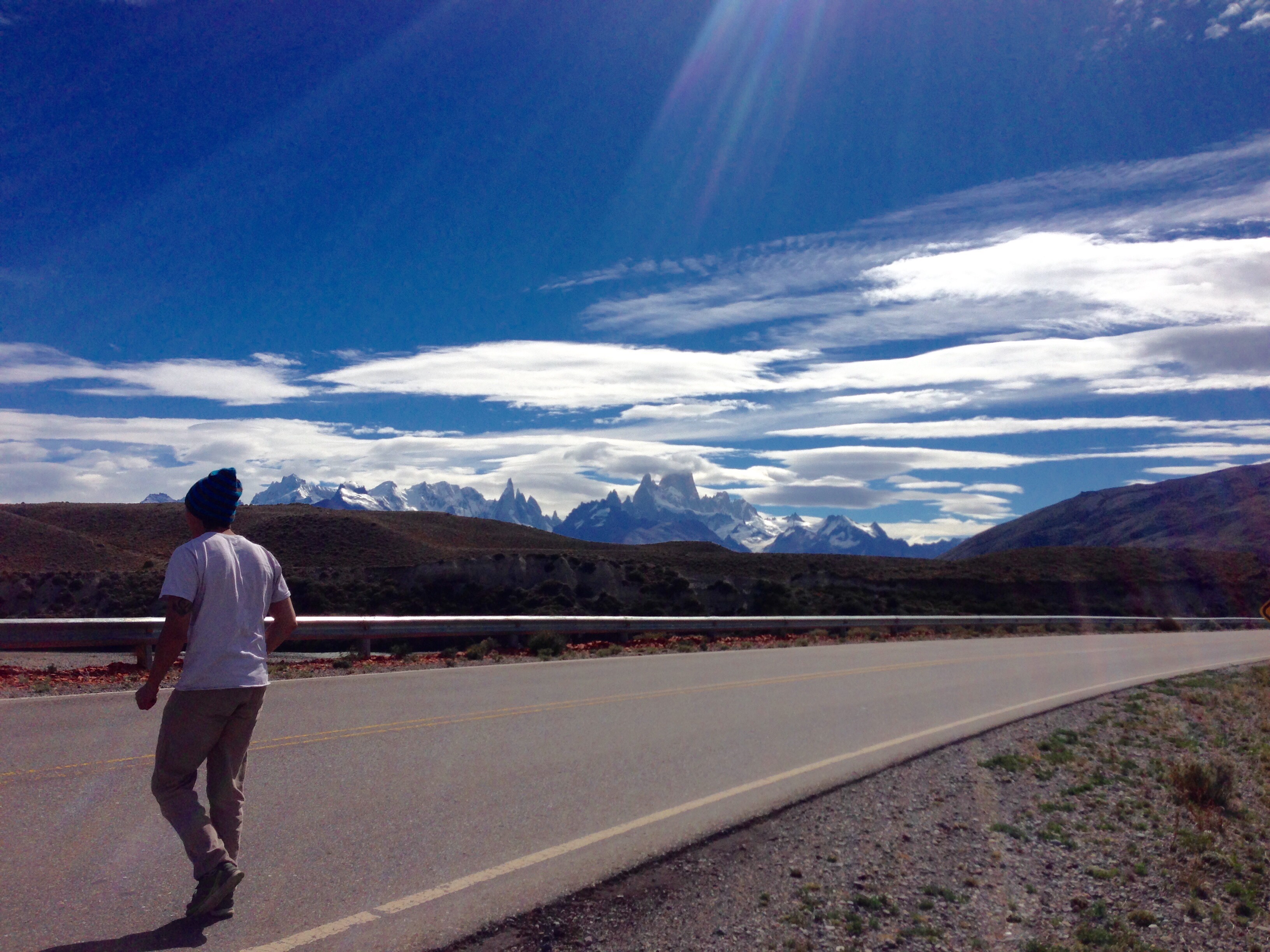 I got an early start into the wind the next day. I could see on the map with the right angle in the road it would be a day of two extremely apposing halfs. Riding with the Patagonian wind at my back was a surreal experience. It’s the closest I’ve felt to flying. The wind picking me up and gliding along without a sound. Completely peaceful with only the whistle of my tires on the road I took in the vast expanse of nothingness of the Pampa. The heat shimmering as it rose of the horizon the only sign of movement. I frequently passed alpaca, though they have another name here which escapes me, would leap over the fences and make off for the distance and the odd emu would be found wandering the road. Carcasses of cows, armadillos and sheep lined the rubble which raised the road. Turning into the wind the noise was horrendous. Reverting to a sideways slant, the same as the fences it appeared the whole world had been tipped on its side to make way for the torment of the ferocious wind. It was a strange experience as with out trees or features it was hard to see any real evidence of the wind until I passed road signs which would shake ferociously. This gave the impression that the only two things of movement were me and the wind itself. Creating a feeling of a very personal battle. I completed 176 kilometers on a day which had 70 kilometres of ripio and feel pretty pleased with myself. Waiting at the junction to the hikers paradise El Chalten I didn’t fancy the 90 kilometres ride off route directly west into the wind but also didn’t want to miss out on the chance of seeing the famous jagged peaks of its mountain, Chalten, though commonly known as Fitz Roy. Martin picked me up with three young Argentinian hitchhiking ladies and we sped of on the pampa west toward the mountains. The range made itself apparent a full 80 kilometres away and was an other worldly sight. We stared at the quickly approaching sight as one of the young girls in the back started crying she was so moved by the sight. We stopped multiple times to walk around and take it in as the wind blew into our faces. Once again I was grateful to my good luck and to Martin, it would have been a sight to miss for sure.