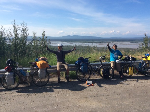 My arrival in Fairbanks co-incided with the rain. Folk of the city were delighted about this considering the 330 fires littering the state which had resulted in a dense smog over the city. I camped In a hostels garden and spent a much needed couple of days relaxing and talking to other guests. Managing to earn a decent slice of kudos after finishing the dalton was handy and I entered a weekend long eating contest with two likeable young brothers from Chicago who had spent the month floating down the Yukon river in a canoe. They were trying to pick up bikes and head up the dalton and I felt I should persuade them otherwise. I called in on Jeannie and Tony’s on my way out of town. Tony gave me a good rundown on the road ahead and an update on the fires, I met the family and listened to some epic karaoke, stocked up on fruit and biscuits to head east along the Alaskan highway, bumping into some Japanese cyclists delighted to see we were all riding the same bikes.